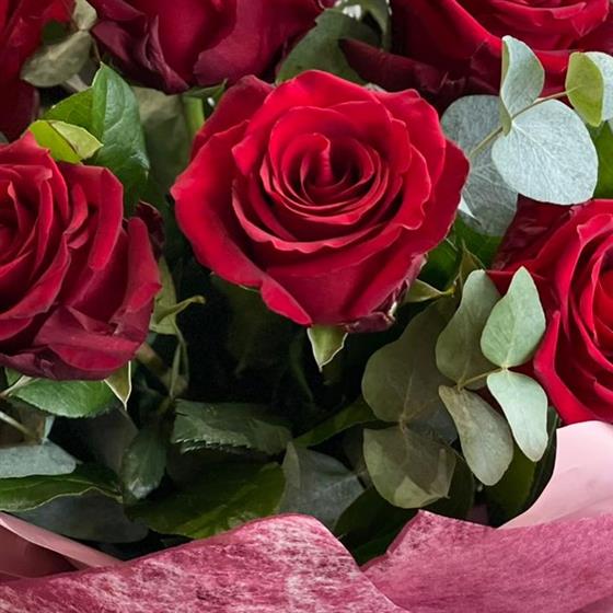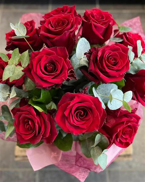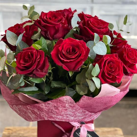 Twelve luxurious, long-stemmed red roses with lush foliage and eucalyptus, beautifully gift wrapped in Amora styling for a classic declaration of love.
