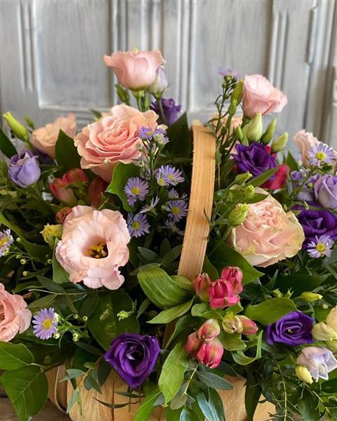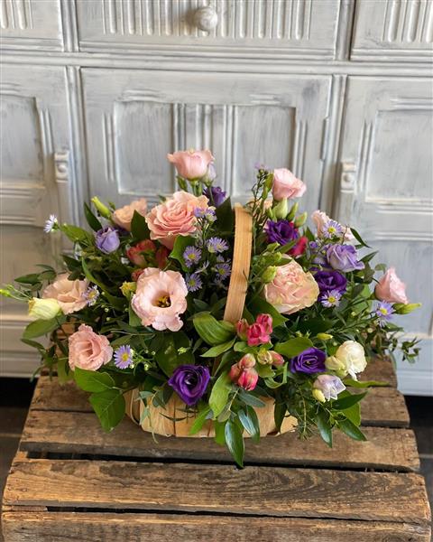 A charming trug filled with blush roses, lisianthus, lilac blooms and fresh greenery, designed to feel like a handpicked English garden. Perfect for birthdays, thank yous and get well wishes.