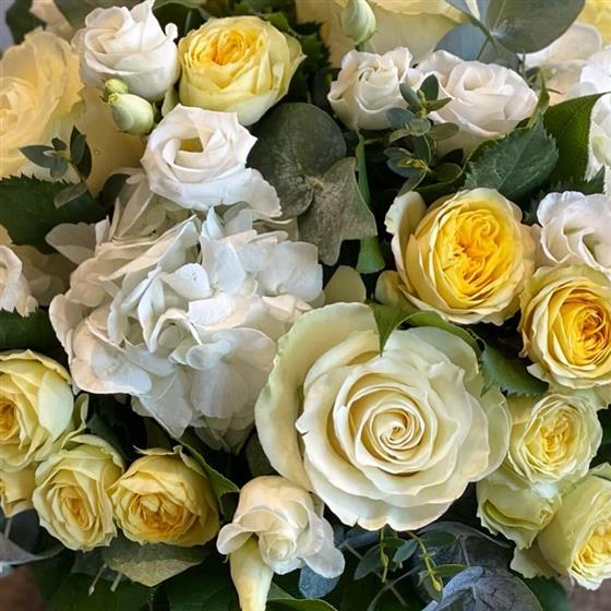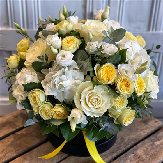 A radiant hatbox bursting with soft yellow and white blooms, including roses and hydrangeas. Perfect for lifting spirits, brightening spaces, and celebrating new beginnings.
