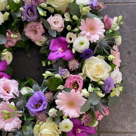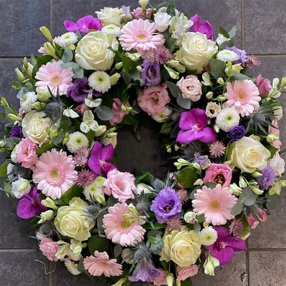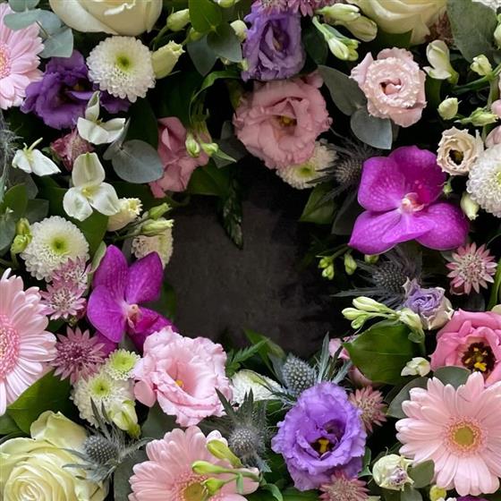 A beautifully balanced floral wreath of pastel pinks, lilacs, and ivory tones. Thoughtfully arranged with roses, gerberas, and lisianthus for a gentle and elegant tribute.