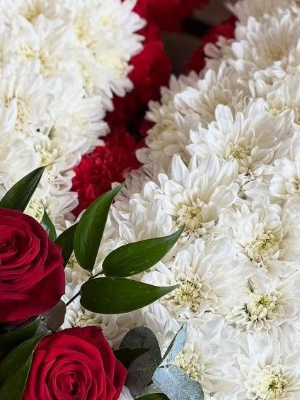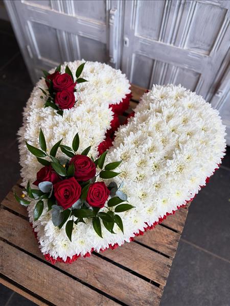 A beautiful 18 inch broken heart funeral tribute created with pure white chrysanthemums and finished with clusters of classic red roses and foliage. This elegant floral design is lovingly prepared by Amora to convey heartfelt sympathy and lasting love