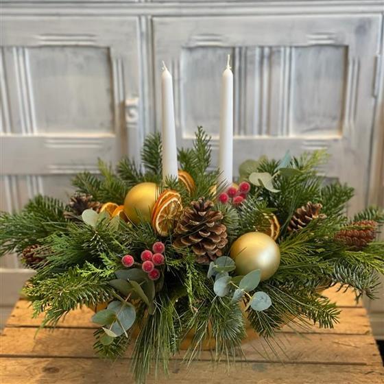 A beautifully festive candle arrangement with fragrant pine, cones, berries, dried fruit and golden baubles. Designed to bring a warm, elegant glow to your Christmas table.