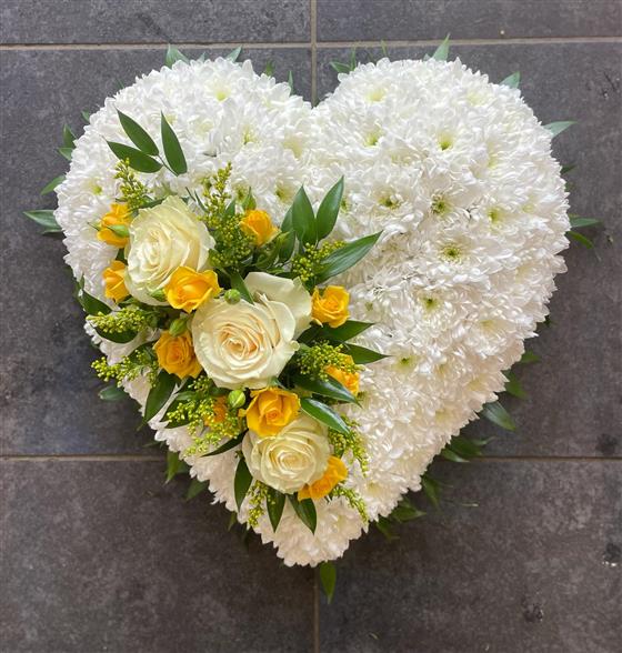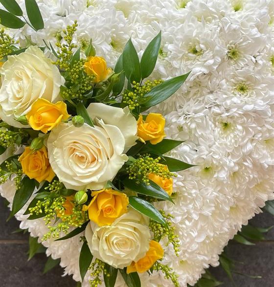 White based closed heart with cream and yellow spray with either foliage or ribbon edge