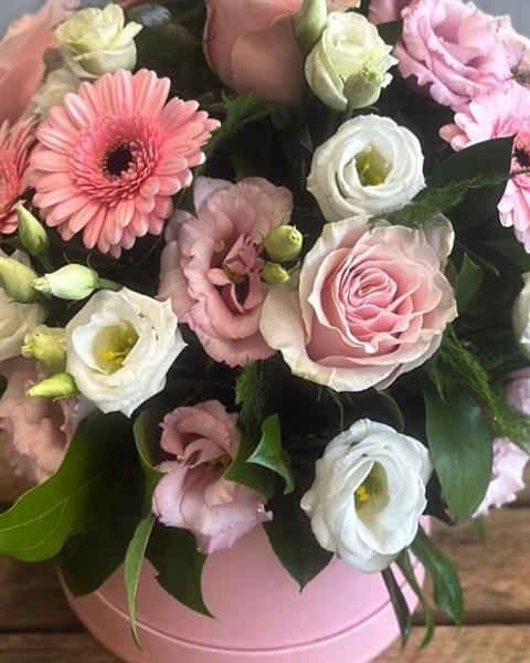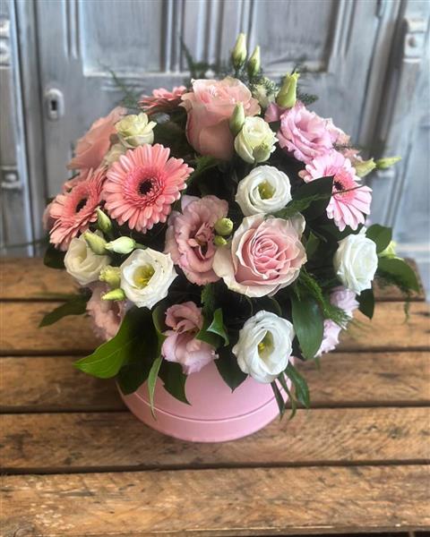 A graceful dreamy hatbox filled with soft pastel blooms and gentle greens, creating a perfectly balanced, soothing arrangement.