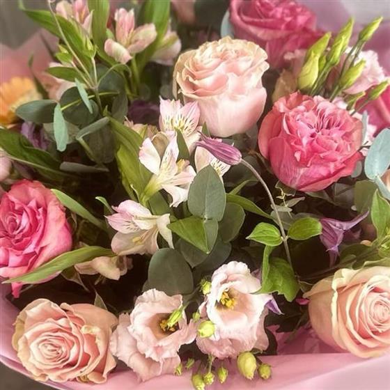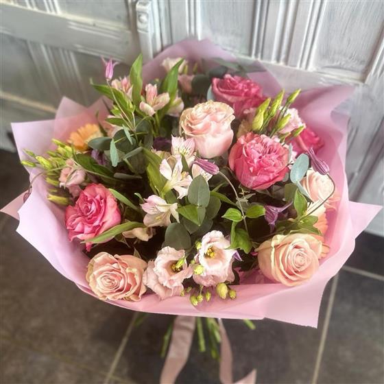 A luxurious mix of blush and rose pink blooms, alstroemeria and lisianthus with fresh foliage, wrapped in soft pink for a signature Amora finish.