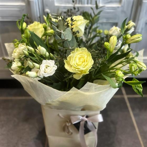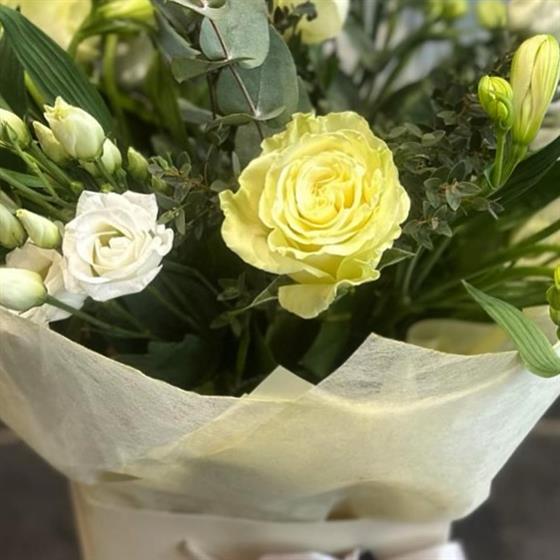 A light and uplifting mix of yellow and white blooms with elegant foliage. Freshly arranged for a cheerful, effortless look perfect for brightening someone’s day.