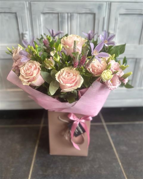 A graceful hand-tied design blending lilac and blush tones with soft greenery. Elegant and modern, this bouquet is perfect for birthdays, thank-yous, or simply to brighten someone’s day.