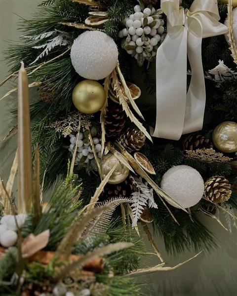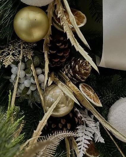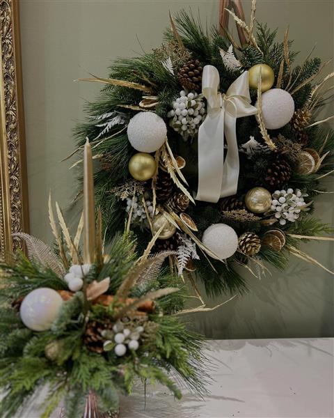 A luxurious Christmas wreath and matching table arrangement featuring golden pinecones, baubles, white berries and festive foliage. Accented with ivory ribbon and touches of sparkle, this elegant set brings timeless Christmas charm to your home. Each piece is beautifully handcrafted by our florist using fresh evergreens.