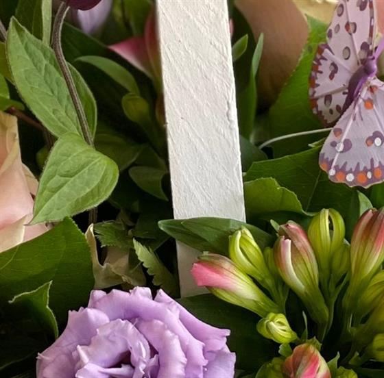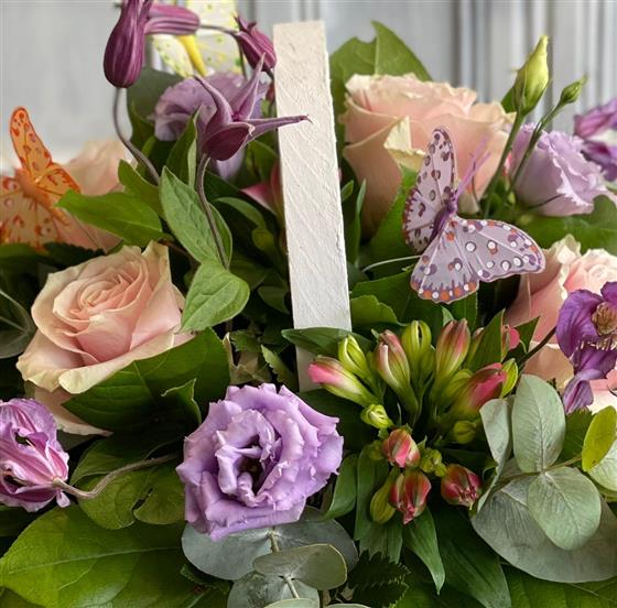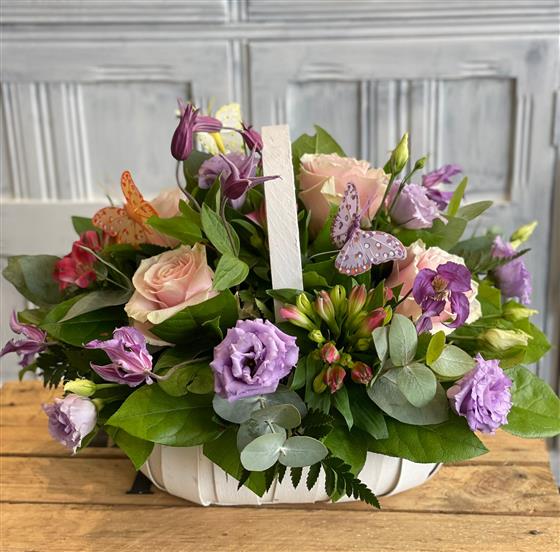 A soft pastel basket arrangement featuring lilac lisianthus, blush roses, and delicate butterfly accents. Fresh, uplifting, and beautifully presented for any thoughtful occasion.