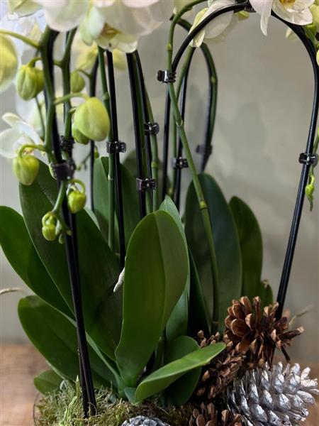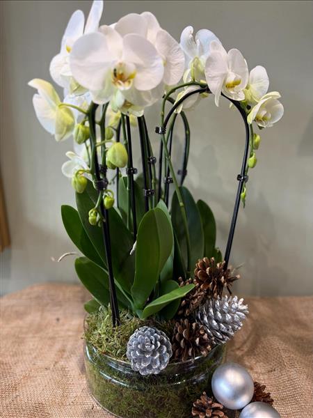A graceful Phalaenopsis orchid arrangement styled with moss, pinecones, and silver touches. A refined winter statement piece for any home or festive setting.