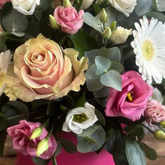 Layered petals in ice-cream shades with textured greenery, designed as a compact, luxurious centrepiece ready to enjoy straight from the box.