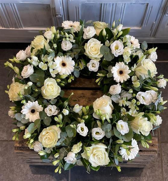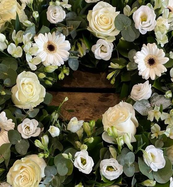 A classic wreath of white roses, germini, and lisianthus, arranged with soft greenery. Designed to convey calmness, purity, and heartfelt remembrance.