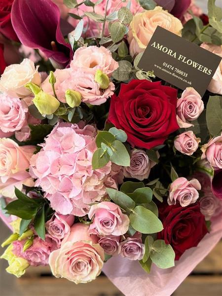 A stunning bouquet filled with rich red roses, soft pink hydrangea, calla lilies, lisianthus and seasonal foliage. This hand-tied arrangement blends deep and delicate tones, creating a luxurious design perfect for gifting or celebration. Same day flower delivery available – send flowers easily from our local florist and order online today. Thank you for browsing our website.