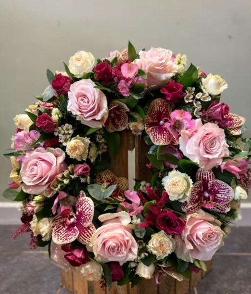 A graceful wreath of pink roses, orchids, and soft cream flowers arranged with natural foliage. A refined floral tribute symbolising love, beauty, and remembrance.