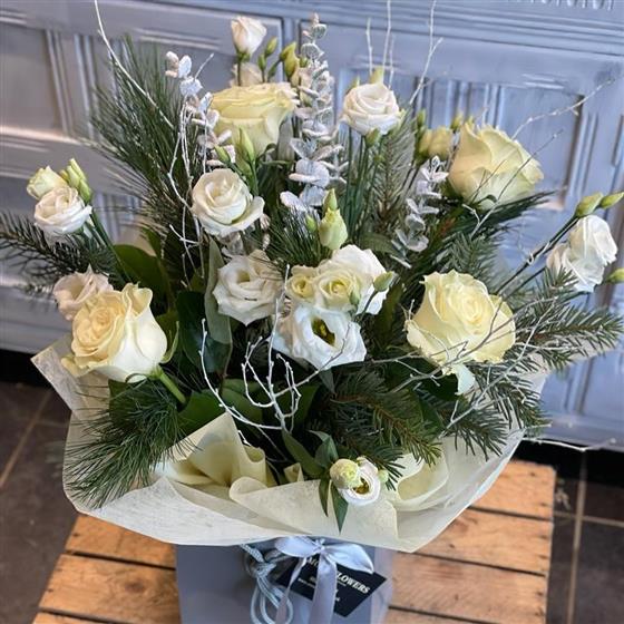 A serene winter bouquet with white roses, frosted foliage and fresh evergreens. Perfect for adding a touch of seasonal elegance to your home or as a graceful festive gift.