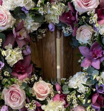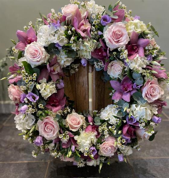 A beautifully detailed wreath featuring lilac orchids, pink roses, and soft hydrangeas. A refined floral tribute offering gentle colour, texture, and grace.