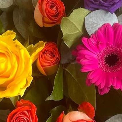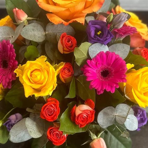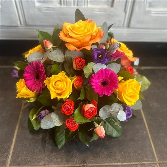 A round floral tribute filled with uplifting tones of yellow, orange, cerise, and purple. Carefully arranged to reflect warmth, optimism, and a life full of colour.