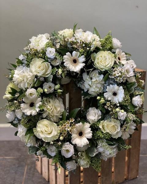 A classic wreath arrangement in gentle ivory and white tones, combining roses, gerberas, and seasonal blooms. Carefully crafted to convey peace, purity, and lasting remembrance.