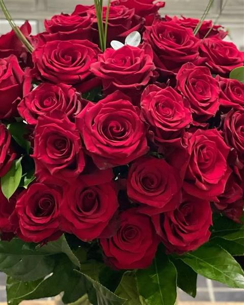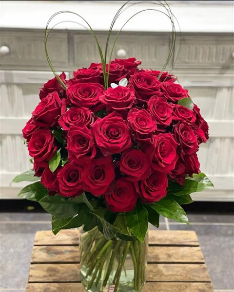 An exquisite display of 50 luxury red roses, hand-arranged in a clear glass vase and finished with lush greenery. This romantic flower design is the ultimate gesture of love and admiration, beautifully prepared by our florist.